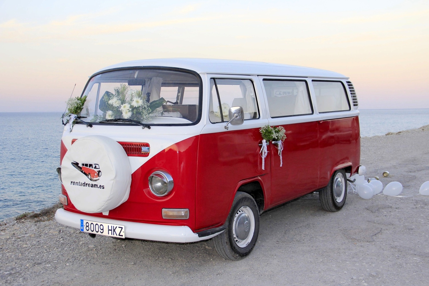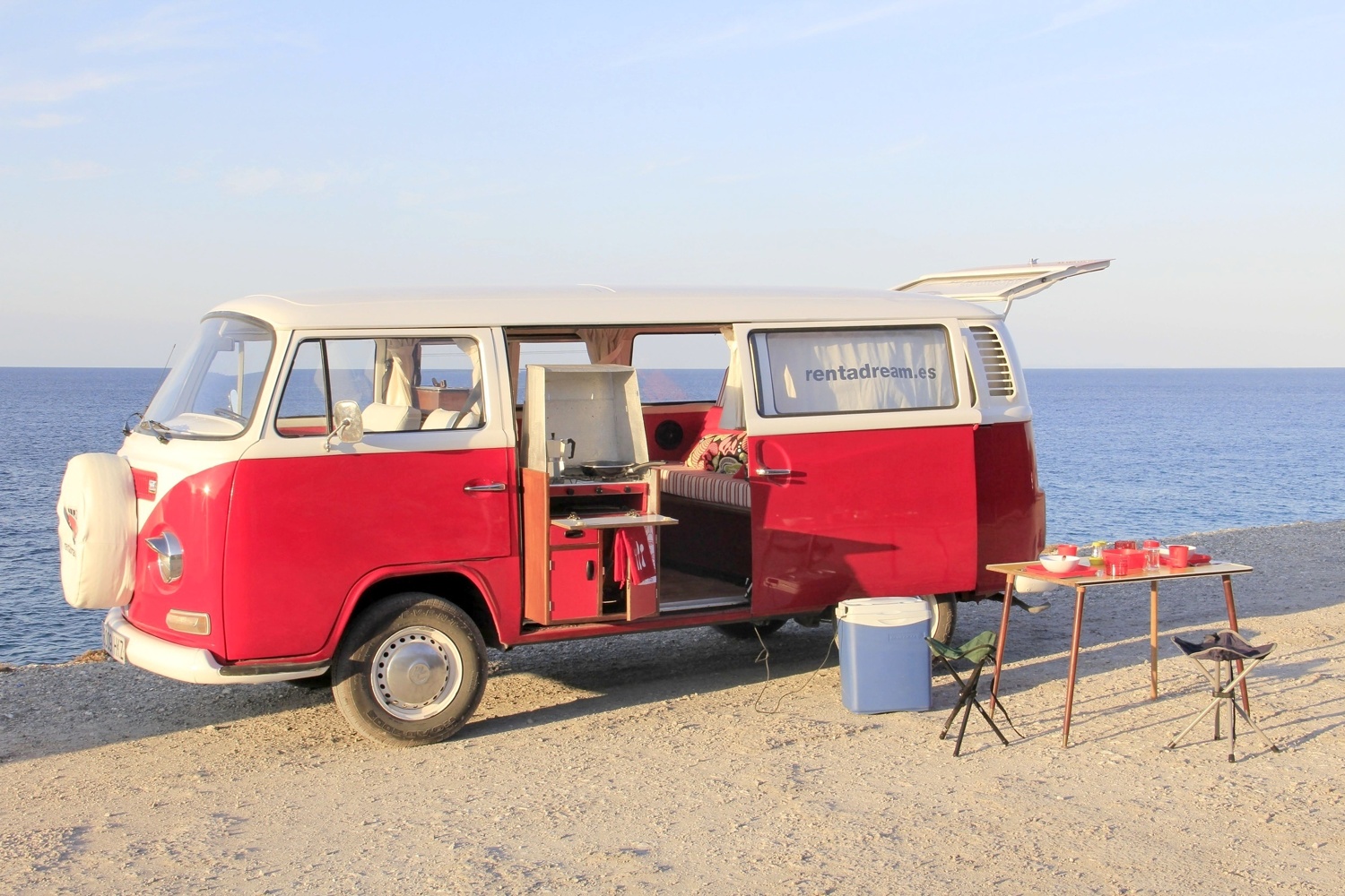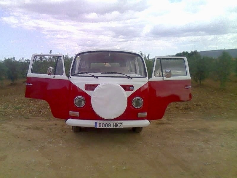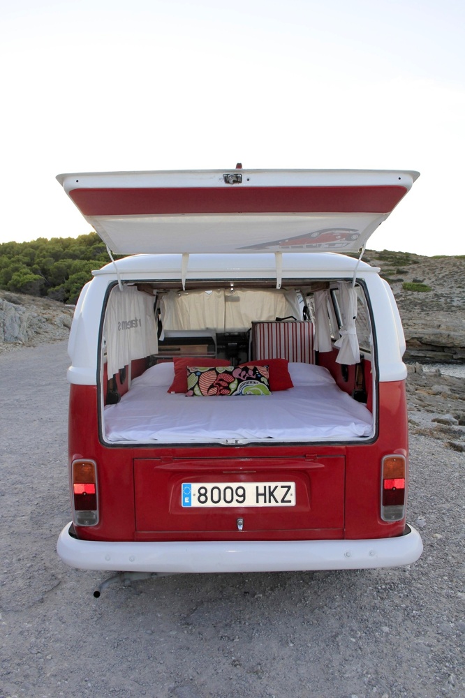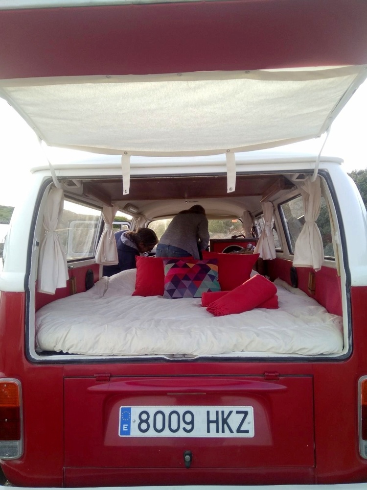 Es una furgoneta Volkswagen T2 del año 1972, tiene el volante a la derecha. Cuenta con un motor de 1600 cc. Totalmente reformada tanto el interior como el exterior en color rojo y blanco con el clásico dibujo en V en la parte delantera y los faros plateados “con pestañas”. Pueden viajar y dormir en ella 2 personas en una amplia cama de 1,50 X 1'85 m. Nuestras furgonetas están equipadas con todo lo necesario para hacer aún más cómodas tus vacaciones.