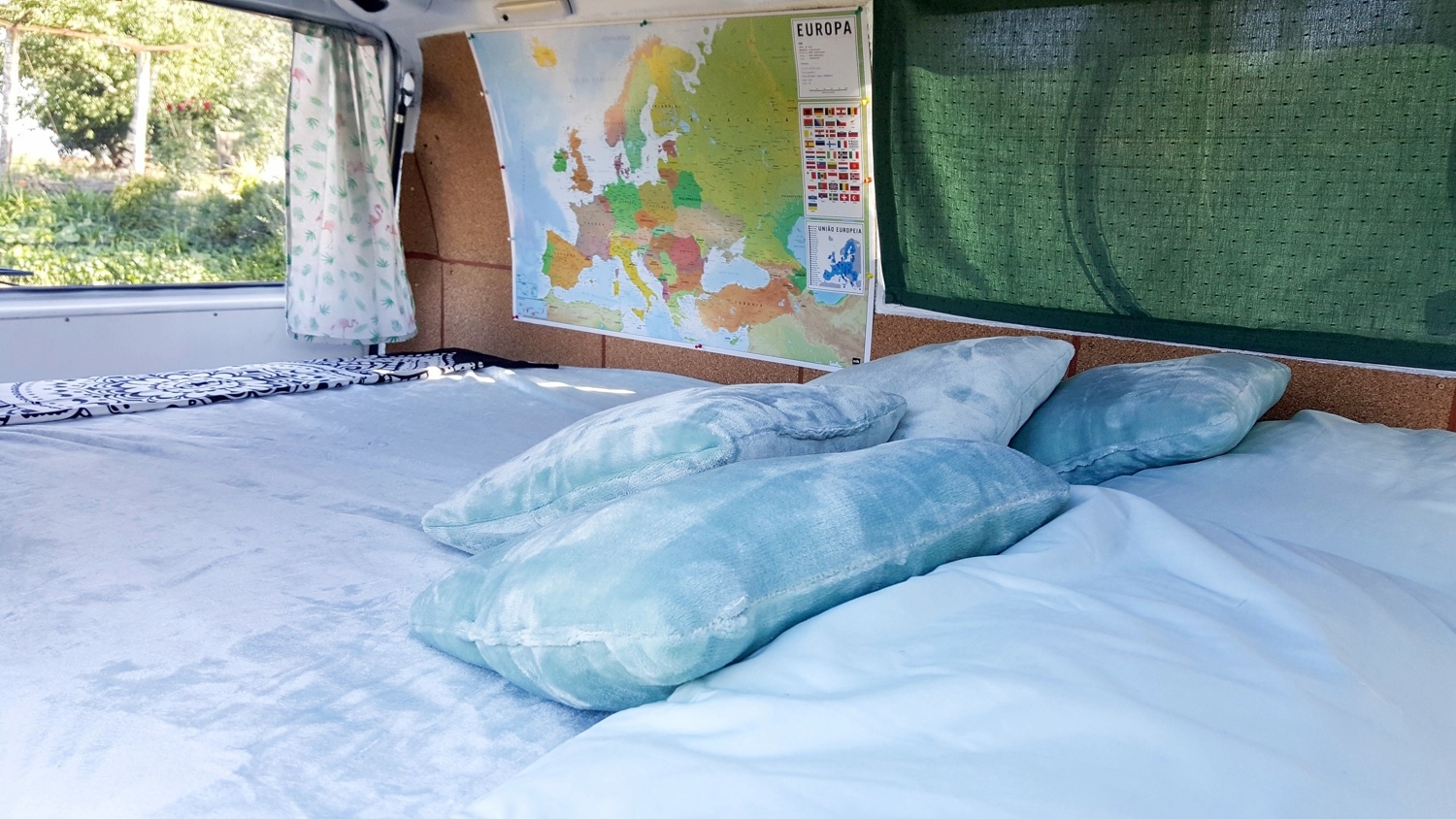 It comes with a lot of equipment and we didn't miss a thing. We got a musicbox, coolbox, table and chairs, cookingplates, tent, towels,... There was enough space for our clothes and stuff and at the same time you find a huge bed in the inside of the van.