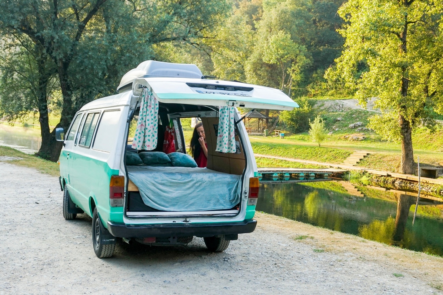 A nossa carrinha é perfeita para uma aventura a dois. Tem uma cama de casal nova super confortável e bastantes arrumos debaixo da cama e na caixa exterior na parte de cima da carrinha.