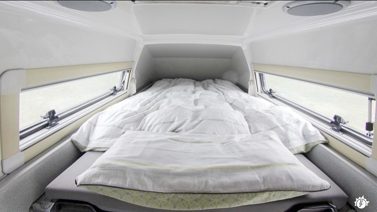 Situada na parte da frente, em cima da cabine de condução. Bastante confortável, esta cama permite-lhe uma maior organização do espaço.