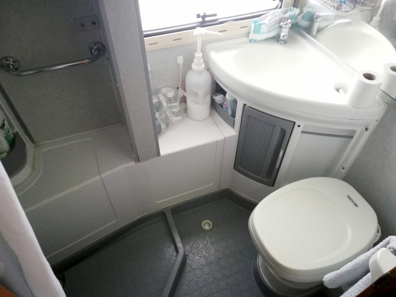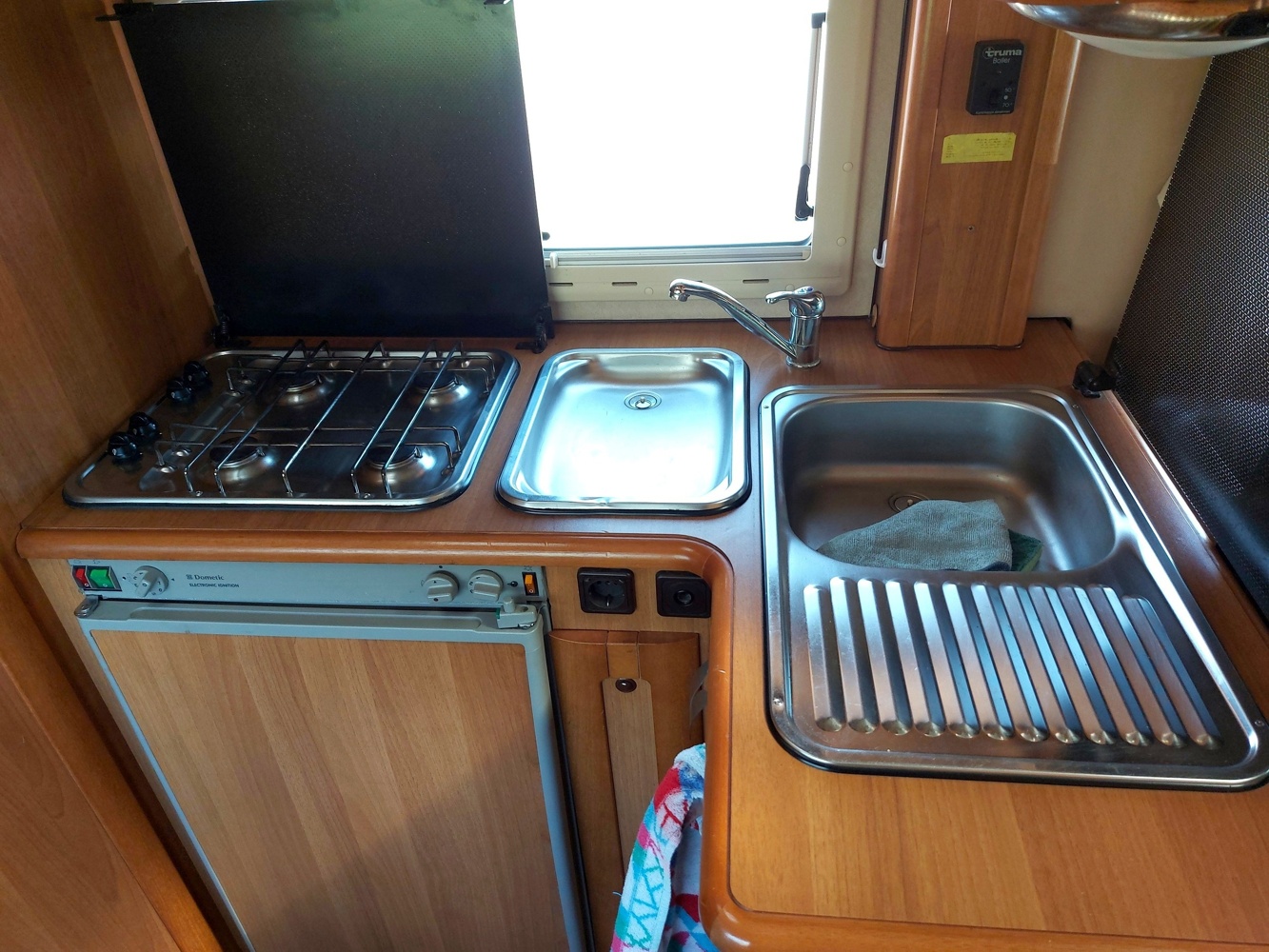 Tienes una amplia cocina con doble fregadero, 4 fuegos para cocinar como en casa y una nevera con congelador (funciona a 12V, Gas GLP o 220V). Dispones de un gran baño dentro del habitáculo con ducha, lavabo y WC. Para descansar y contemplar las vistas puedes montar una amplia mesa (incluida en el alquiler) en el exterior. Dispones de avance por si se hace molesto el calorcito del sol.