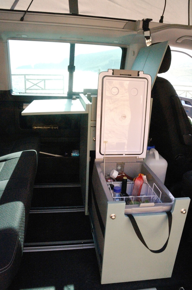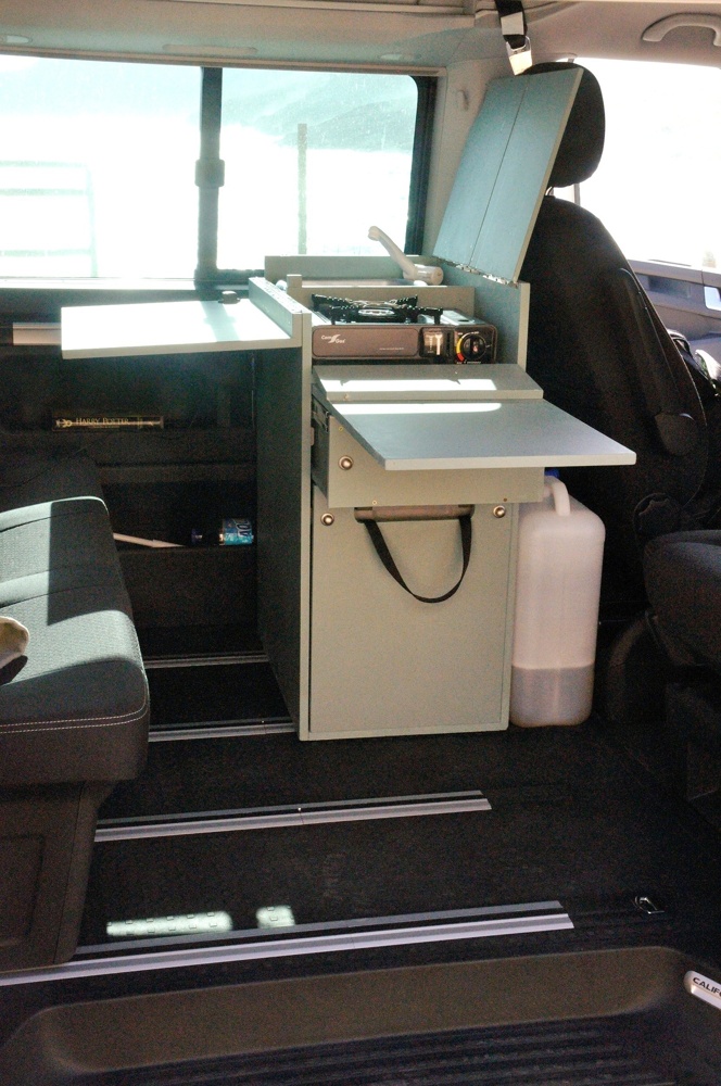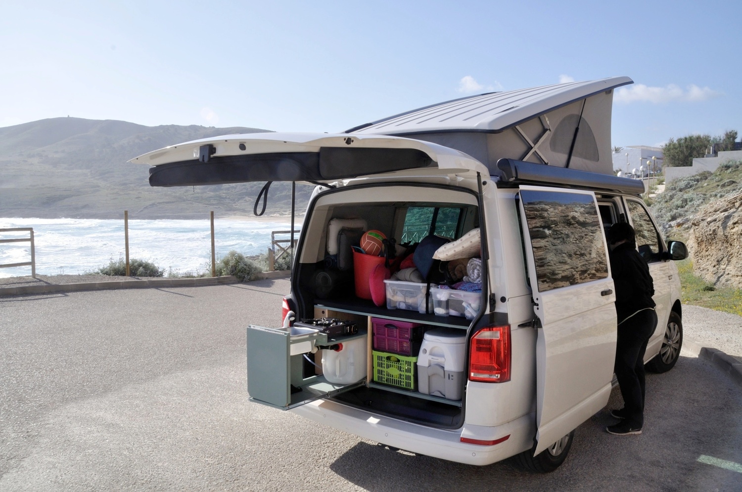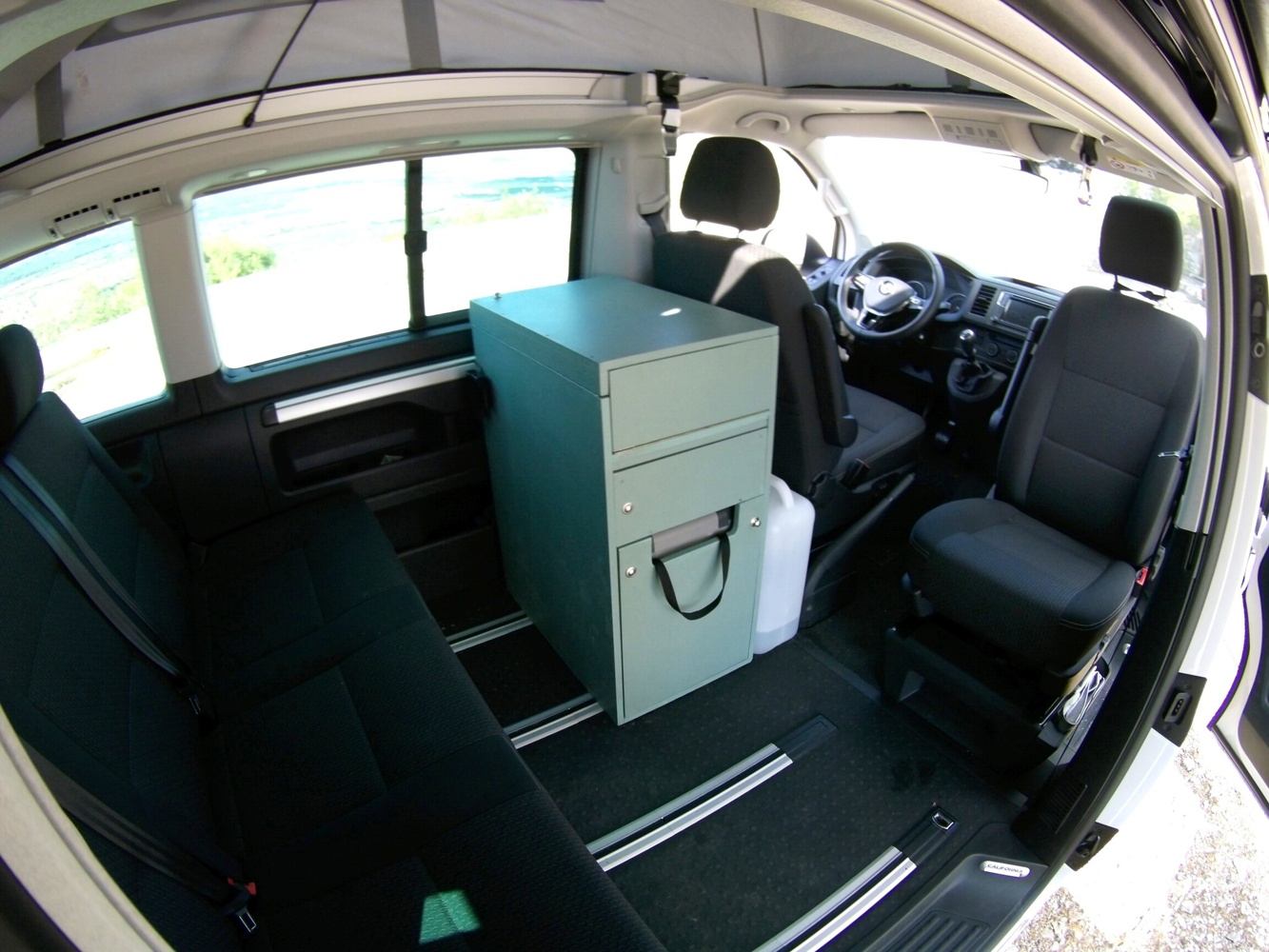 Detrás tiene ducha y fregadero con agua caliente, zona para cocinar, nevera de 40 litros y un práctico potti. En la zona de 'estar' se puede añadir un mueble con fregadero, cocina y nevera.